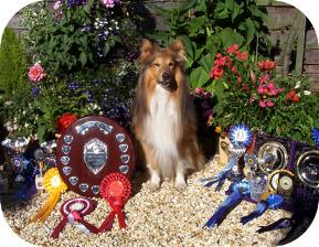 Jed (Trudy's first agility dog) proudly showing off a selection of his trophies and rosettes in 2007